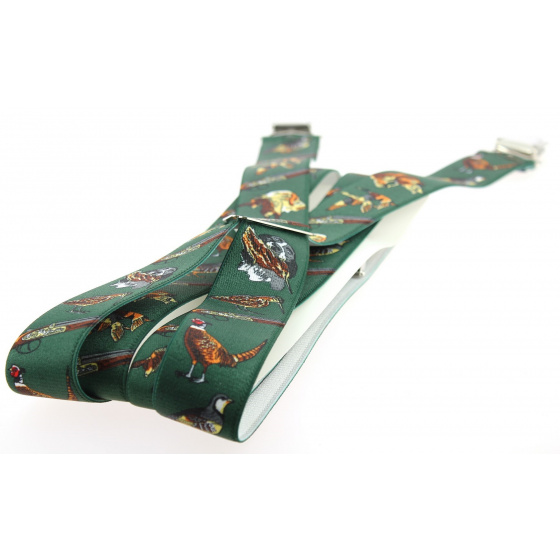 Beautiful suspenders made in France, with a 35mm wide elastic band, and an X shape. A model with different patterns of birds in flight on a green background.
