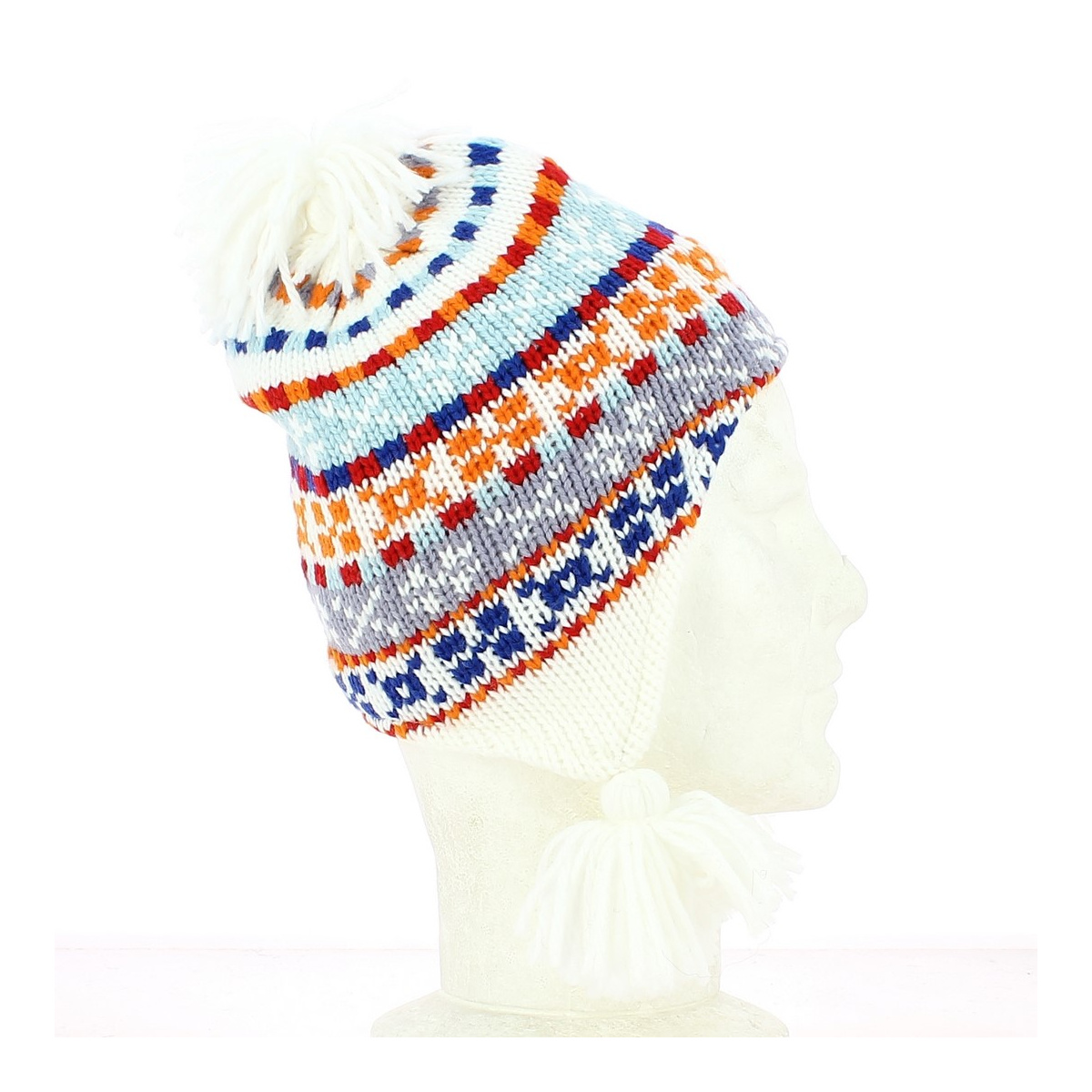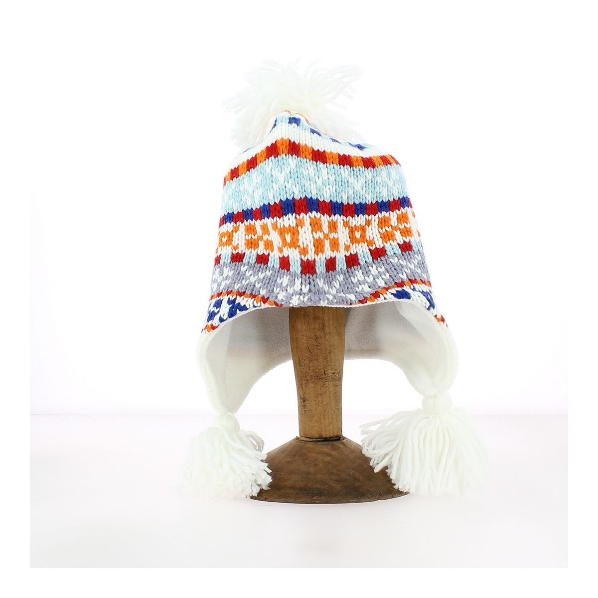 A superb colorful ear flap beanie with pompoms for children lined with white fleece for incomparable softness and warmth.