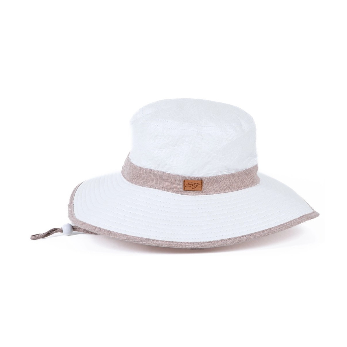 Hat made by SOWAY® in a wide-brim bob style, anti-UV, for men and women in white with matching ribbon and trim.