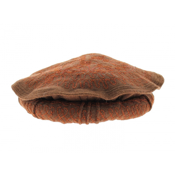Authentic brown Pakol handmade in Pakistan, an embroidered model for women