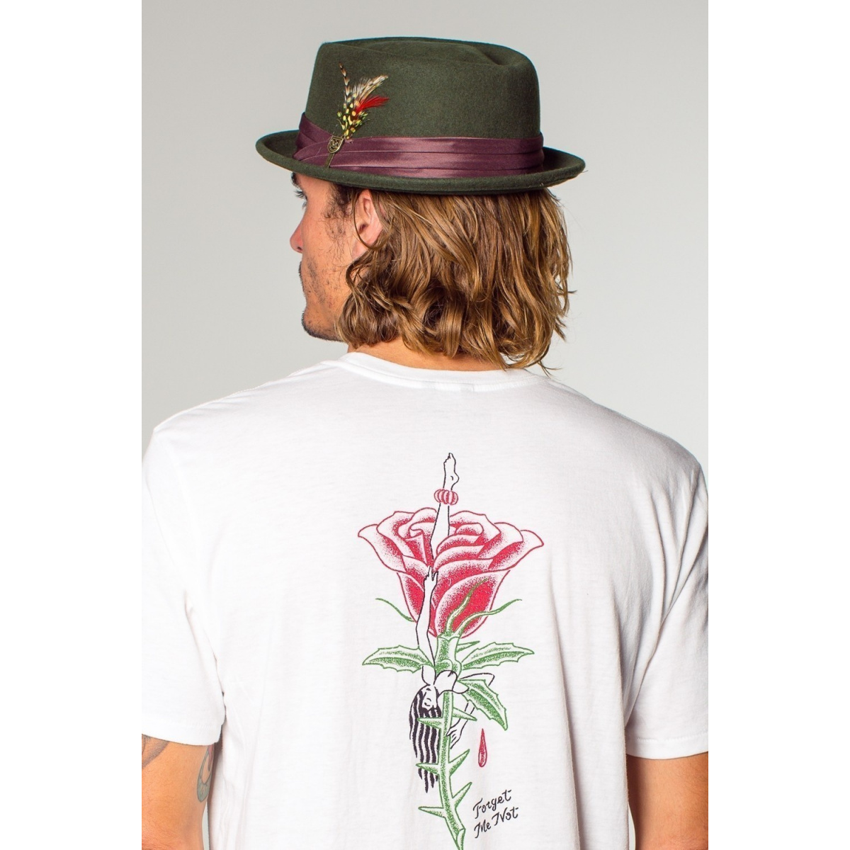 The Brixton motto: "May you never eat your hat when you're hungry". The Stout is a pork pie shape; meaning it has a flat crown on top and a small curled brim all around the hat. The Stout is made of wool felt and has a matching color ribbon. A feather adds a bit of charm.