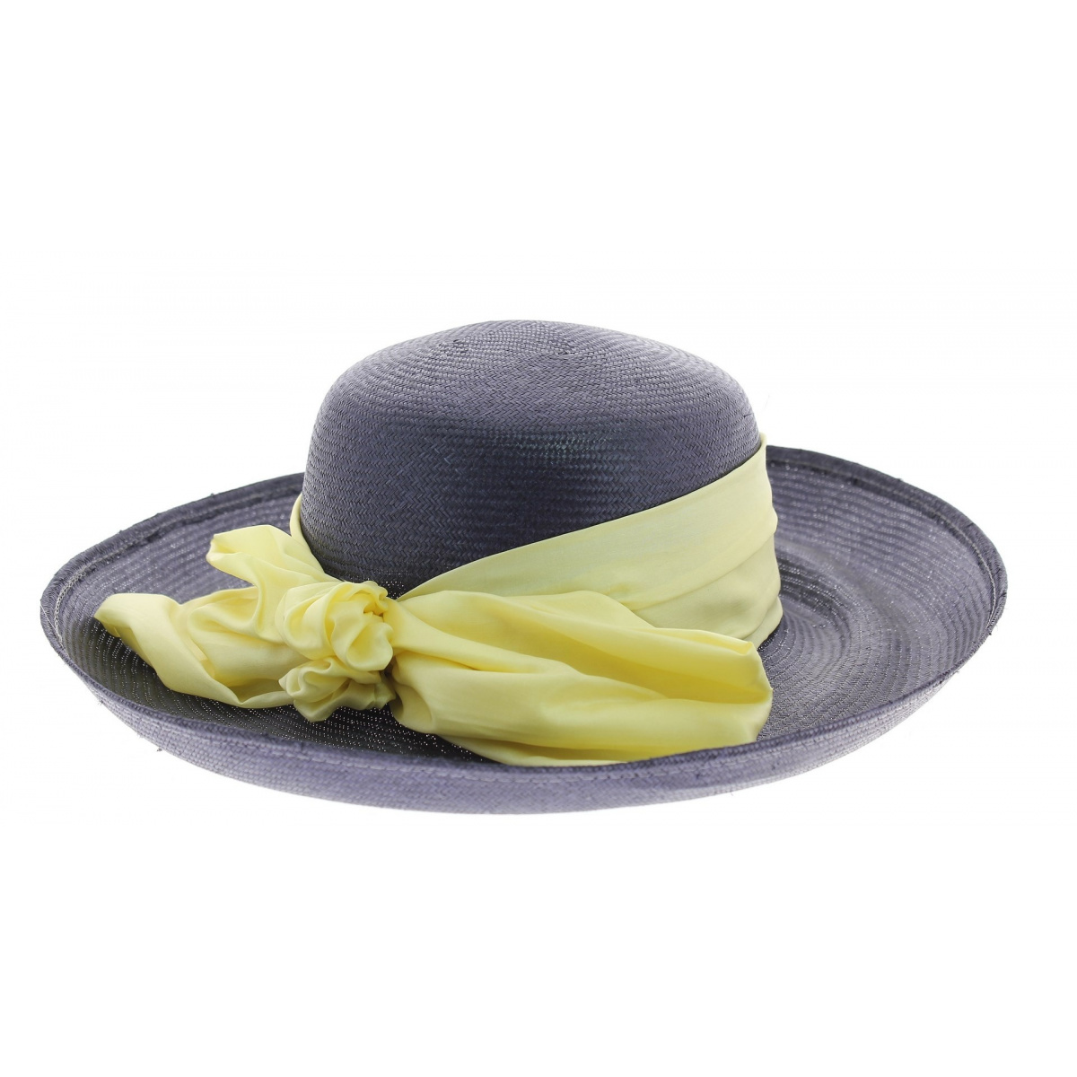 Here we have a model in blue with upturned edges, decorated with an elegant ribbon in a shade between yellow and off-white. The craftsmanship of this hat offers both beautiful finishing quality and pleasant comfort. Perfect for a ceremony or simply for a walk in town, it will provide you with elegance in any circumstance.