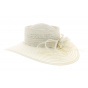 Natural straw wide-brimmed hat for your ceremonies with a flower and ribbon on the side.