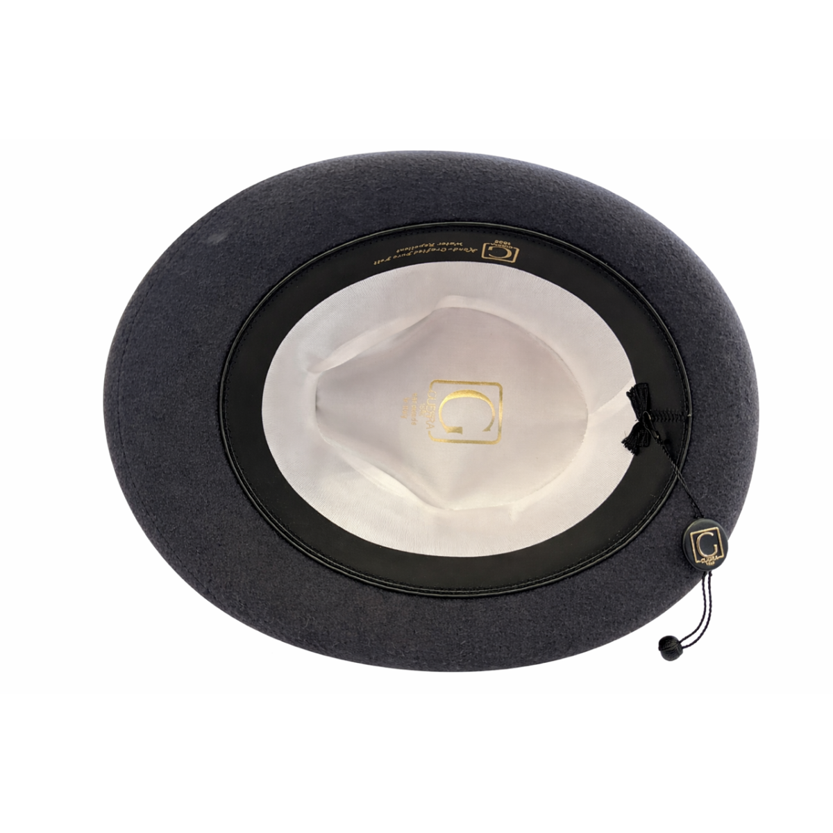 Classic style fur felt hat in grey with 5 cm brim upturned at the back and lowered at the front; water-resistant. Very beautiful finish with satin lining and leather interior.