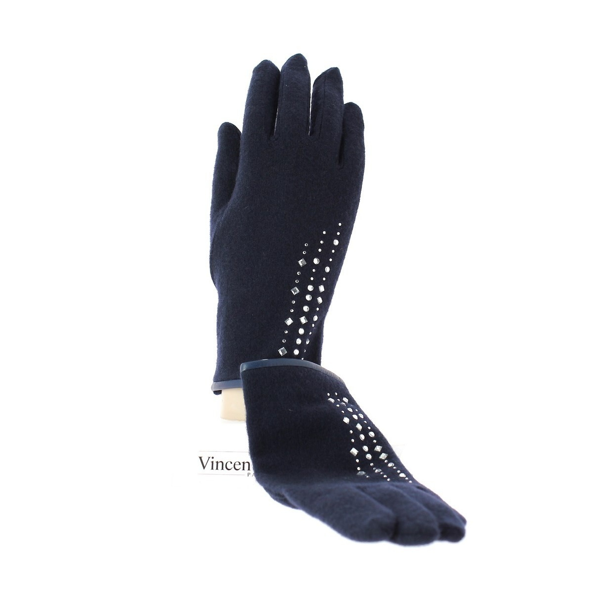 A pair of women's gloves in 80% wool and 20% nylon in navy color with rhinestones.