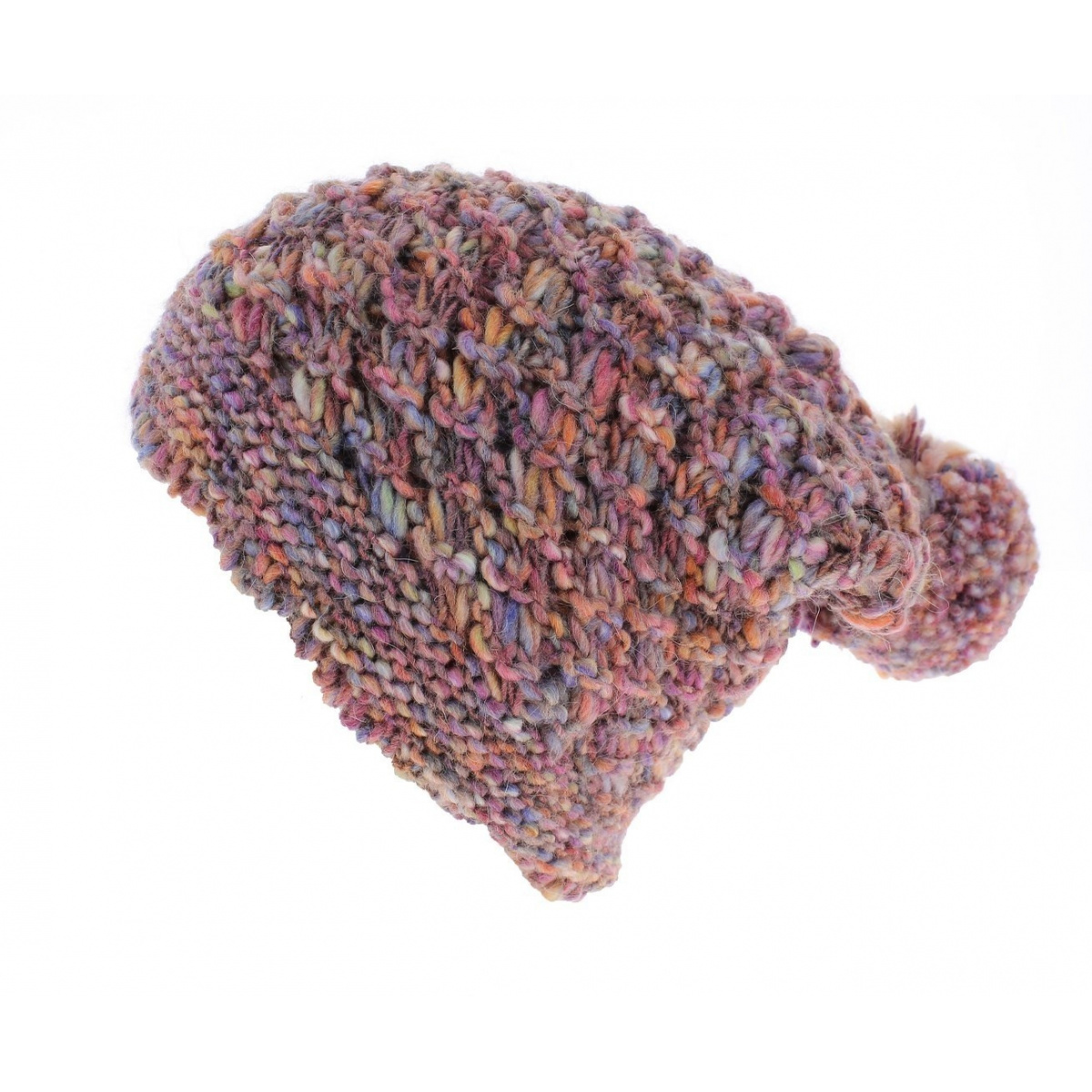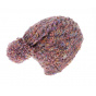 An oversized beanie multicolored with a pompom. With its thick knit, it will provide you with warmth and optimal comfort to face the winter season, and its old rose color, the seasonal trend, puts you at the peak of chic.