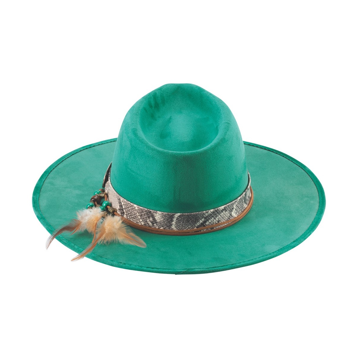 Made of 100% turquoise suede, it will easily adapt to your wardrobe and will distinguish you with finesse and elegance, reinforced by the brown leather grosgrain highlighting the crown.