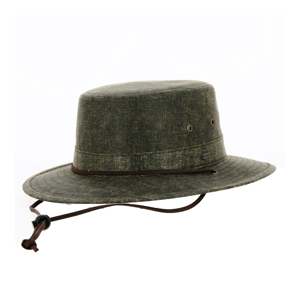 The traditional Traveller hat revisited here in a 100% cotton model with an aged leather look.