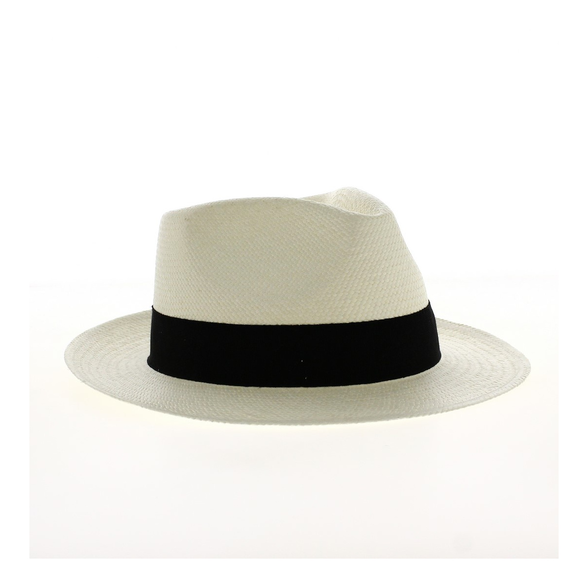 A model made of 100% panama straw, in a white color topped with a black fabric grosgrain band on the exterior. A traveller hat entirely revisited in Ecuador in a chic and trendy style.
