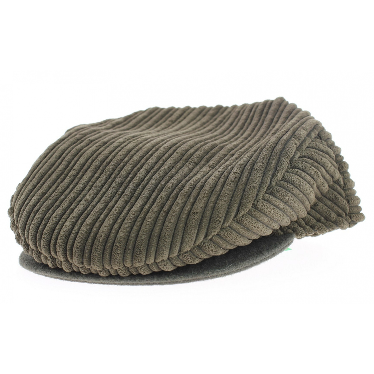 Flat Roannaise cap in khaki corduroy; it features a sweatband, snap-on visor with a warm lining suitable for winter.