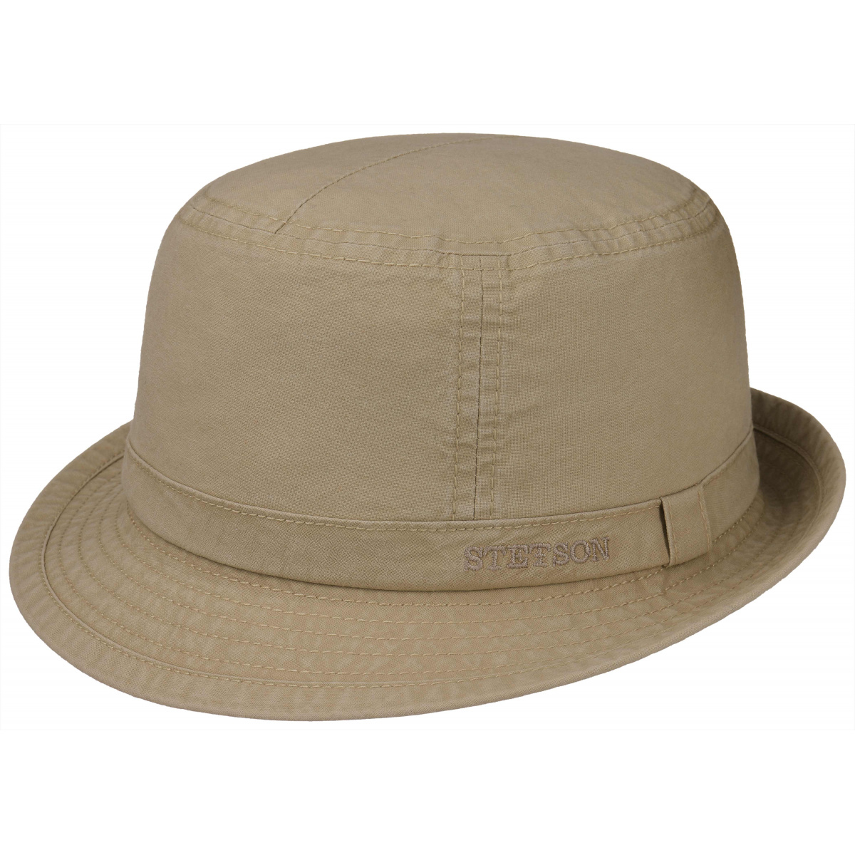 A bucket hat with a Trilby shape. This Stetson USA hat is made of cotton with a slim cut, cotton material in a washed-out style.