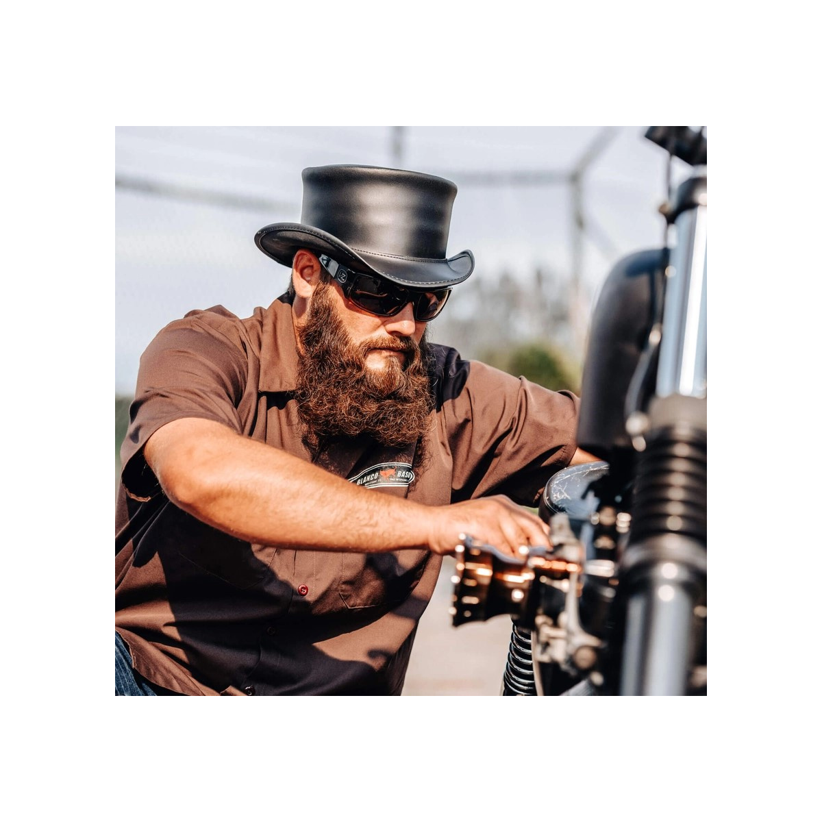 A half top hat style hat that displays very high quality, made from 100% leather handmade in the USA.
