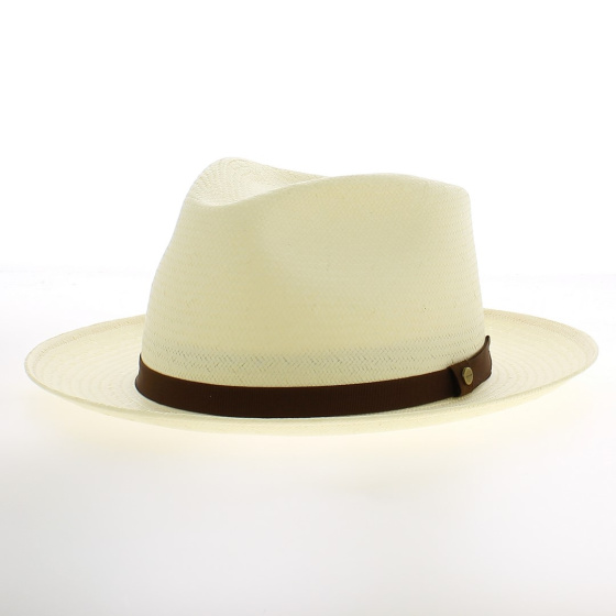 Elegance, lightness, and tradition come together perfectly in this natural straw Panama hat. A true icon of summer style, this authentic model captivates with its pinched crown silhouette and wide protective brim. Its shade is enhanced by an elegant chocolate brown grosgrain ribbon, adding a subtle and refined contrast.