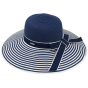 This hat made of 88% paper straw and 12% polyester stands out with its wide 13.5 cm brim, navy blue and white striped coloring and shape that gives it an elegant, chic and feminine touch.