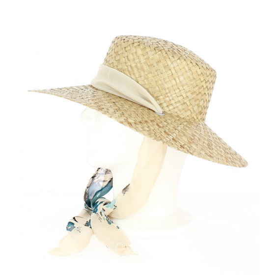 A women's sun hat with a beautiful lightweight fabric scarf that you can tie around the hat, your neck, or let it hang as you wish. It immediately adds a very chic and feminine touch to this model.