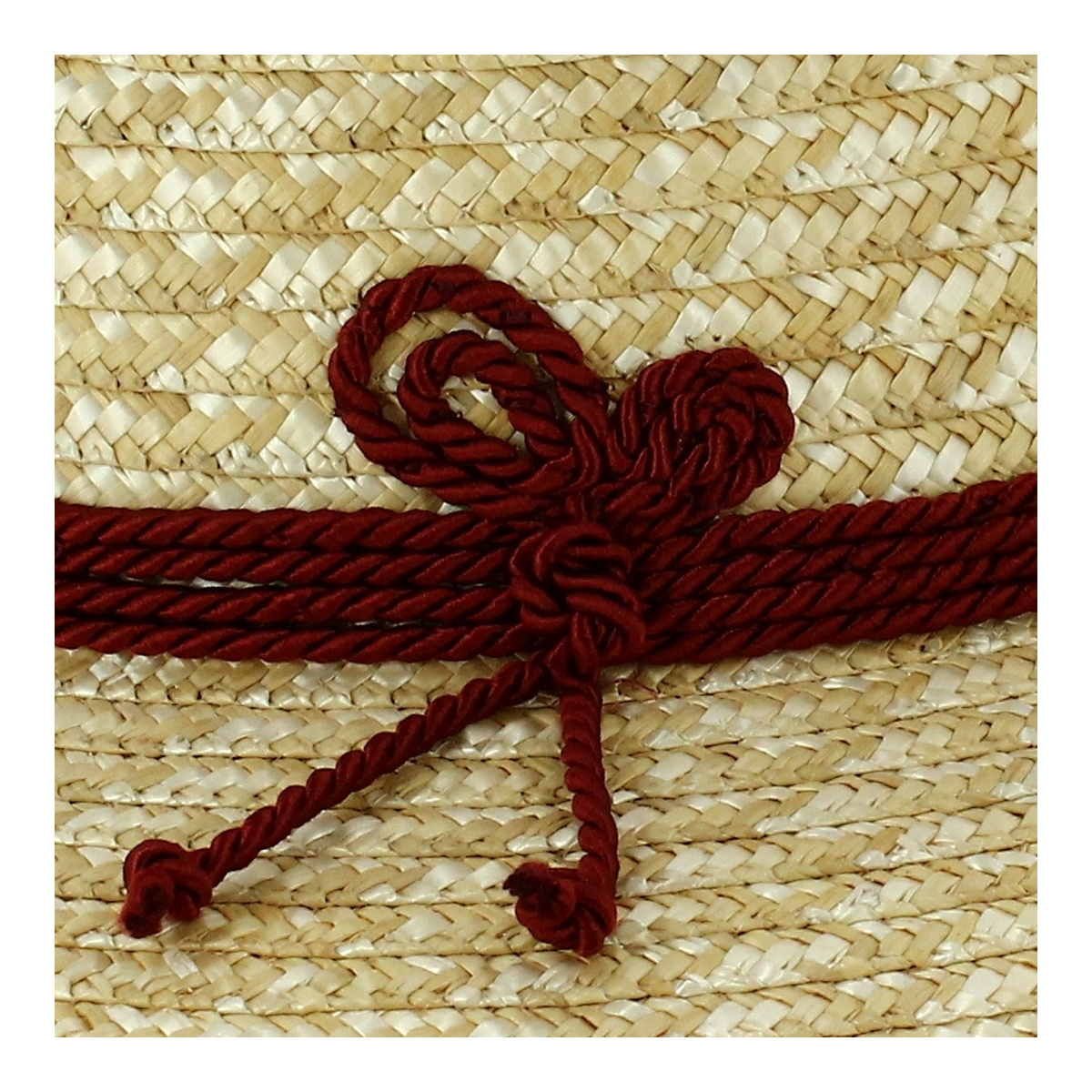 The natural straw wide-brimmed hat with large burgundy trim is the ideal choice for those seeking an elegant and functional accessory for sunny days. Its classic design and refined color make it a versatile accessory that can be worn with various outfits. Made from high-quality materials, it is designed to last and add a touch of timeless elegance to your summer wardrobe.