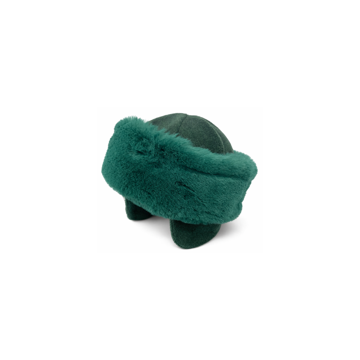 Women's green fur toque with integrated ear flaps and khaki fleece fabric.
