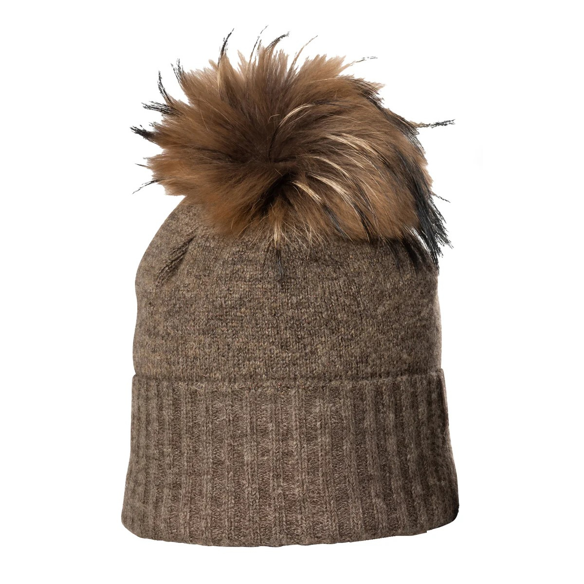 Un très joli bonnet de ski à pompon fait de fine maille, un modèle fait de laine et acrylique avec pompon en fourrure véritable de raton laveur. Un bonnet signé par la marque Kristo en coloris taupe .