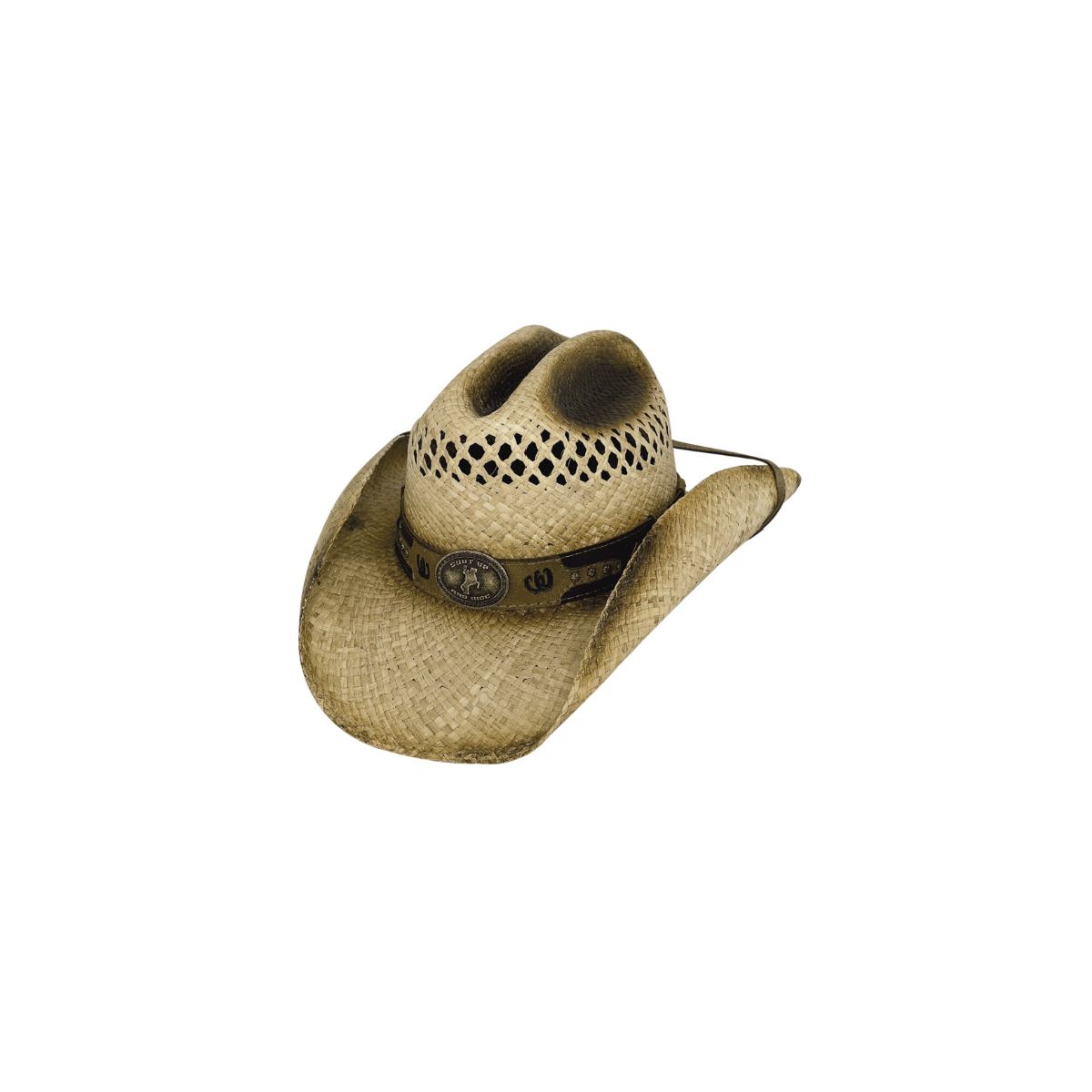 Style cow-boy avec ce chapeau en 100% paille naturelle. Look rustique légèrement vieilli, bande décorative avec fers à cheval et inscription « Shut Up And Ride ». Confortable avec jugulaire ajustable et bande interne, parfait pour vos aventures en plein air.